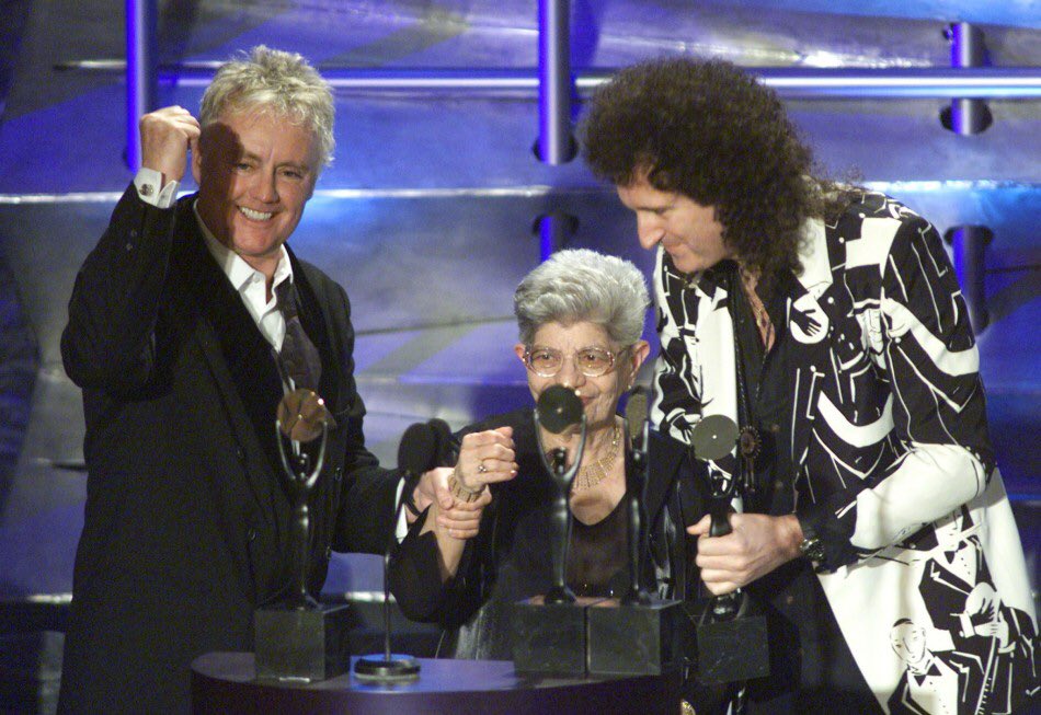 בראין מאי ורוג׳ר טיילור מקווין, עם אמו של פרדי מרקורי, מקבלים את הפרס במהלך הטקס של שנת 2001